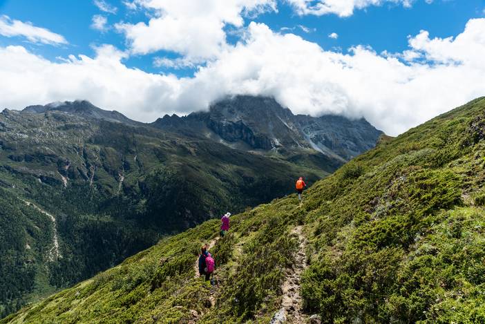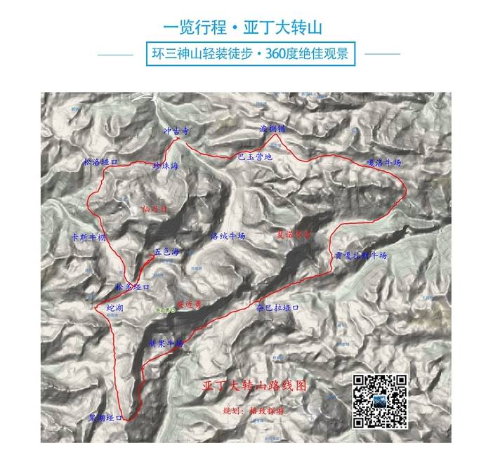 亚丁大转山是格致探游于2018年开创的路线,是在当地藏民大转山的基础上经过多次探路而确立。相对声名鹊起的“洛克线徒步”,亚丁转山的路线更贴合约瑟夫·洛克博士当年行走的足迹,而且全程与三神山相伴,风景比洛克线更胜一筹,更有波拥措这一可以拍摄三神山同框的绝美湖泊。可谓是名副其实,而全新升级的“徒步洛克线”。