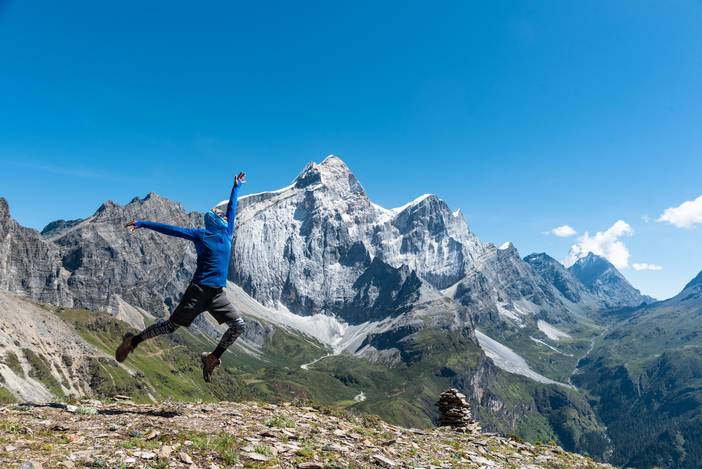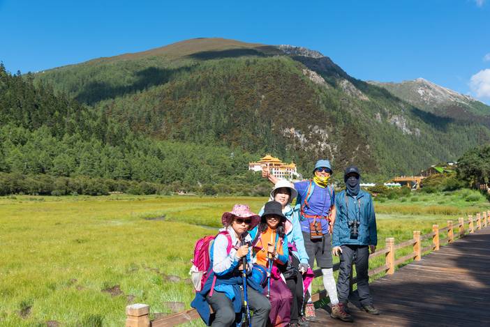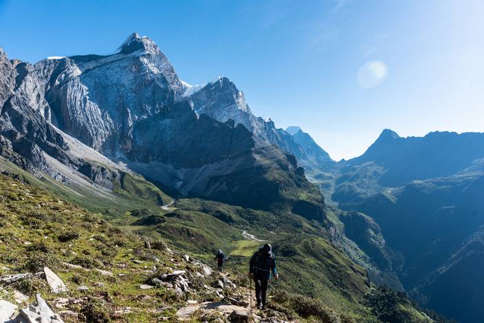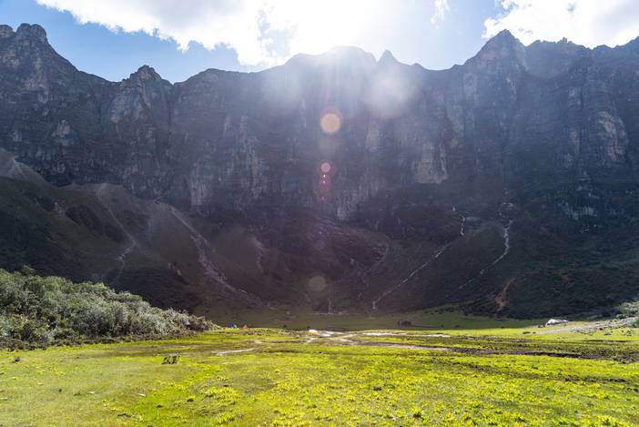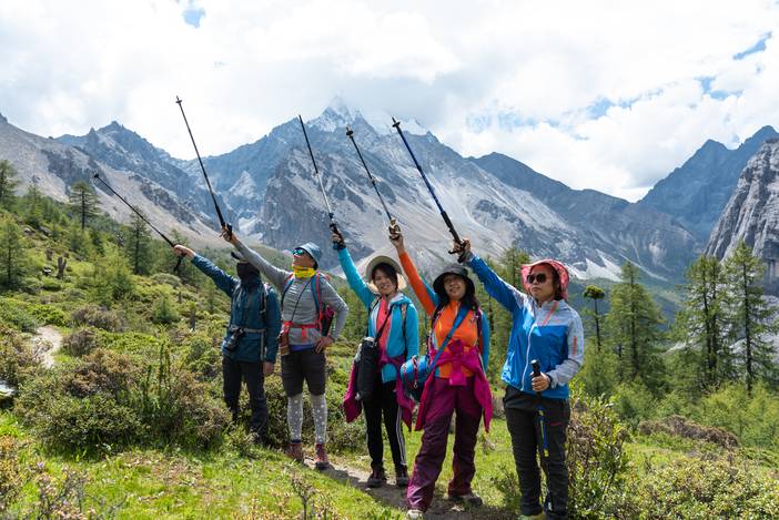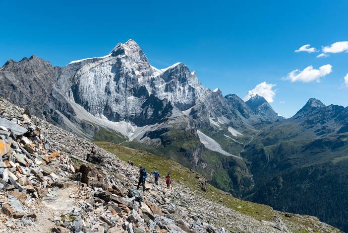 徒步Day4,清晨的万里无云,给了我们最大的惊喜,而夏诺多吉神山的日照金山更是美不胜收。我们一天的徒步之旅都是在灿烂的阳光中进行,当然大家都是拿出头巾和防晒霜,做好了充分的防晒措施,避免被太强烈的紫外线晒破皮。