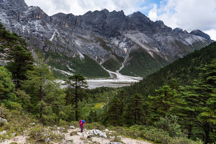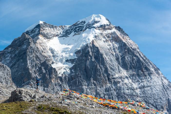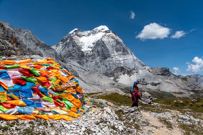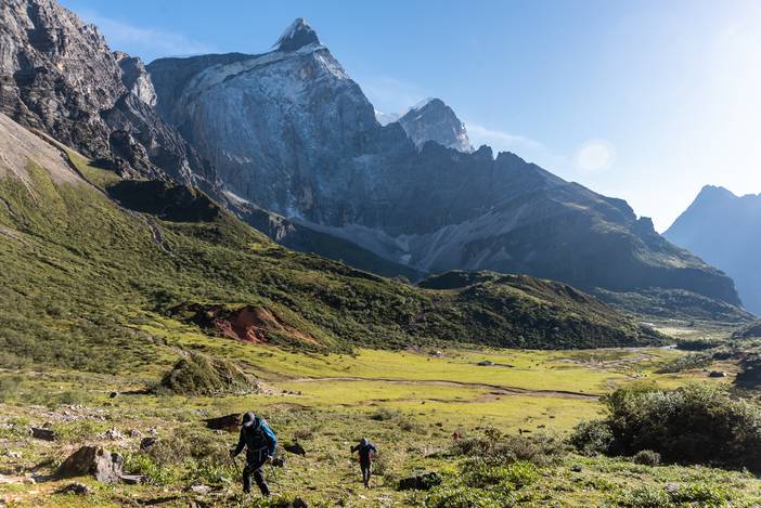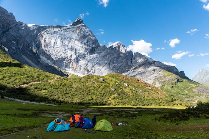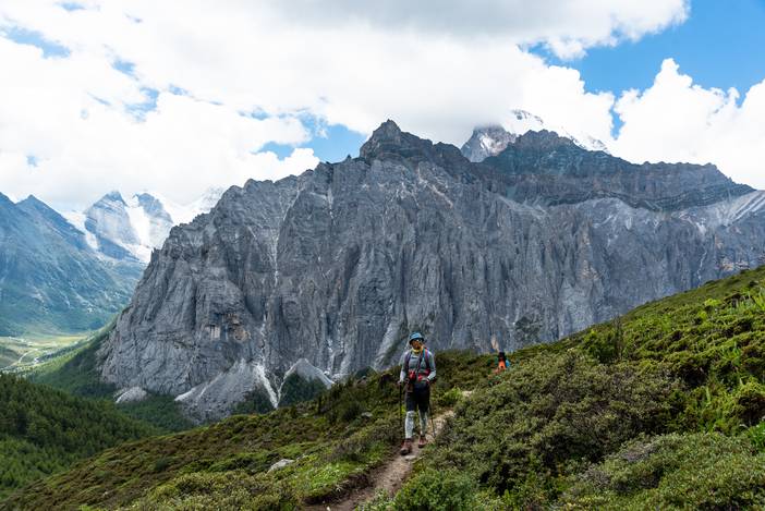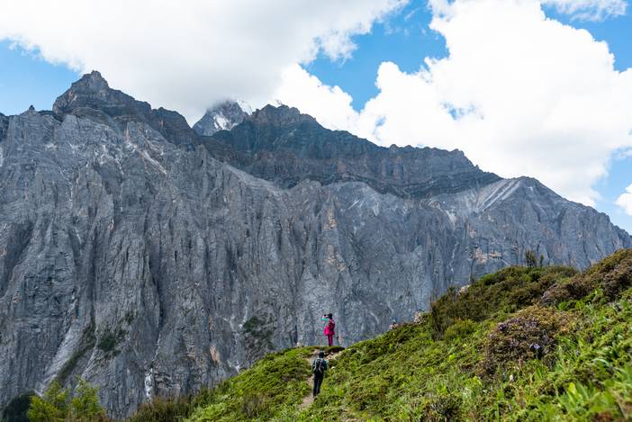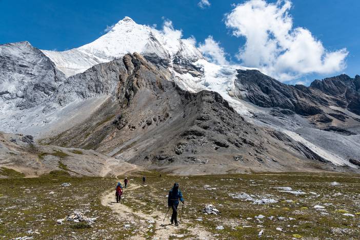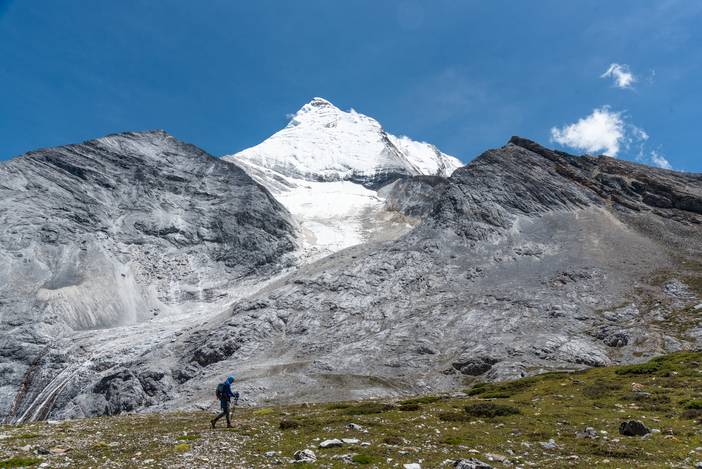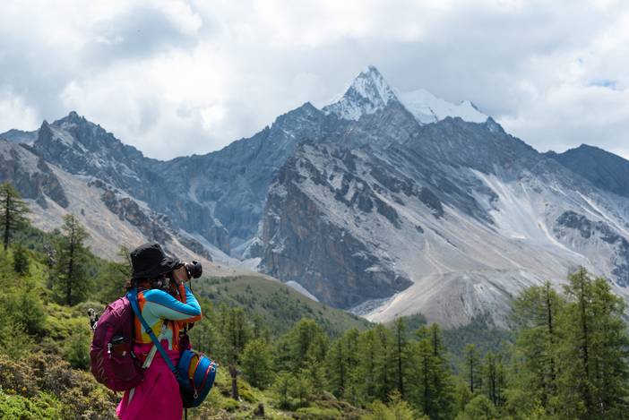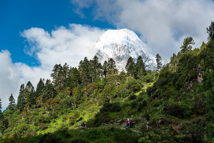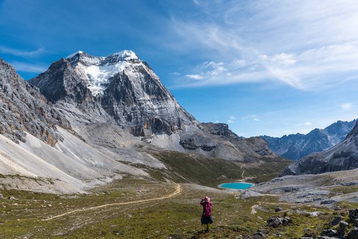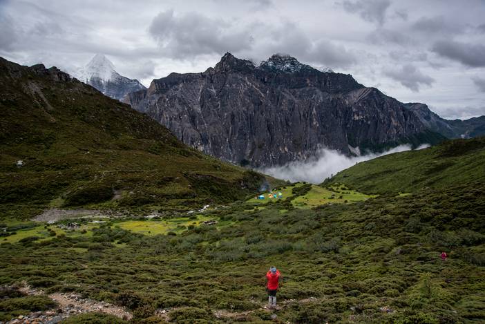瓦蓝的天空下,仙乃日如一座宫殿立地而起。我们从仙乃日山脚下的冲古寺开始徒步,穿越丛林和高山灌丛,来到海拔4500米的巴玉营地。