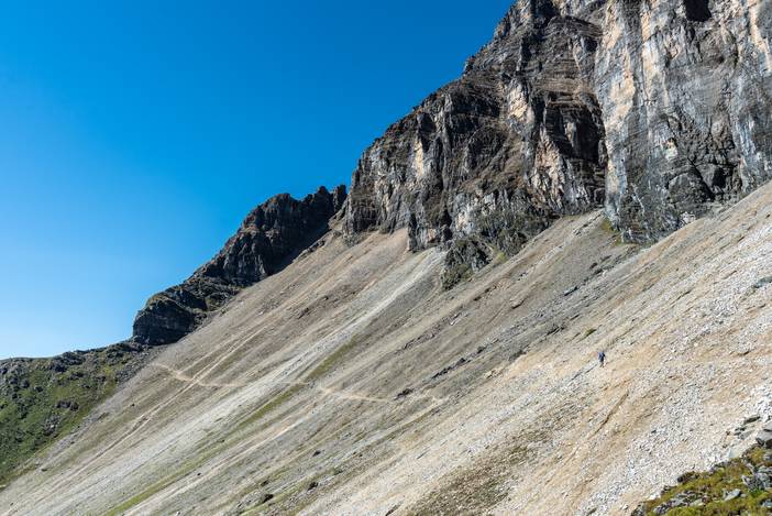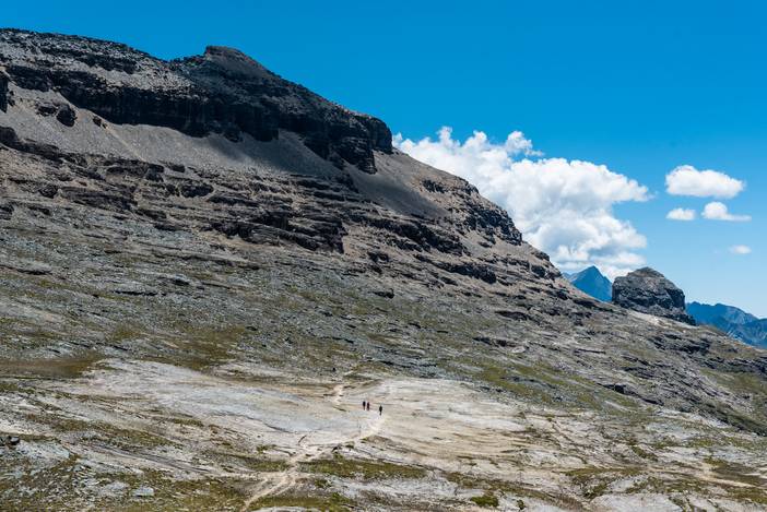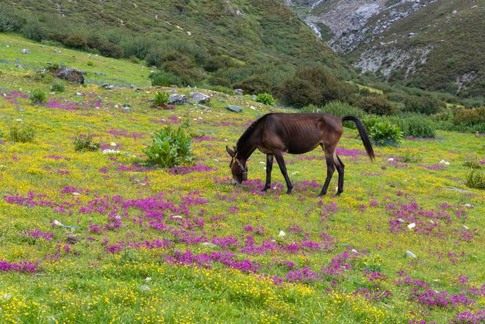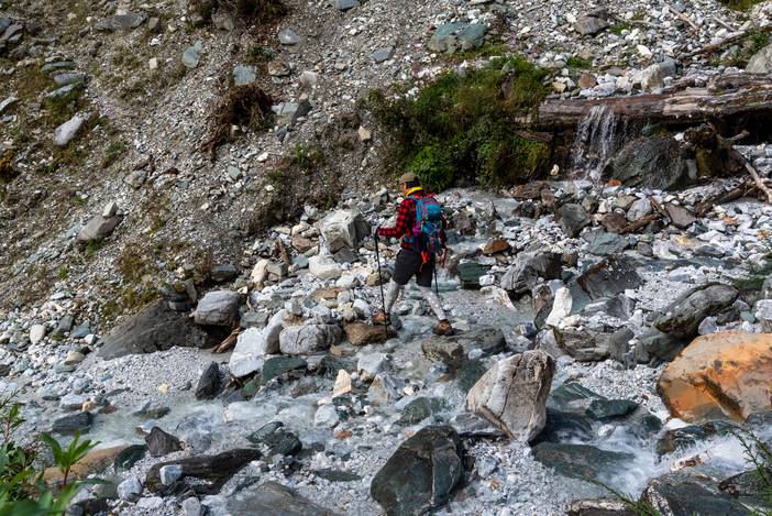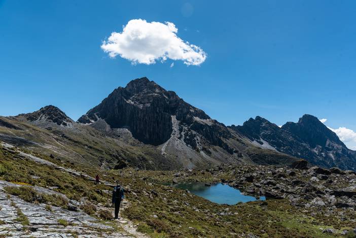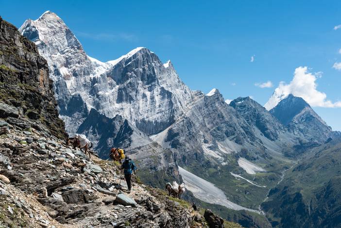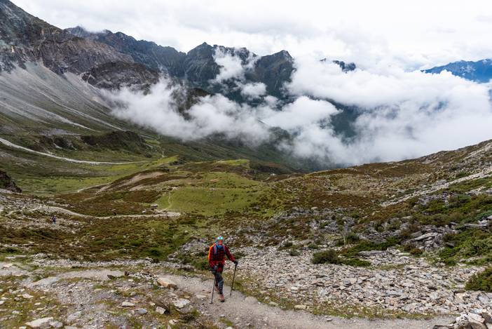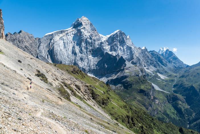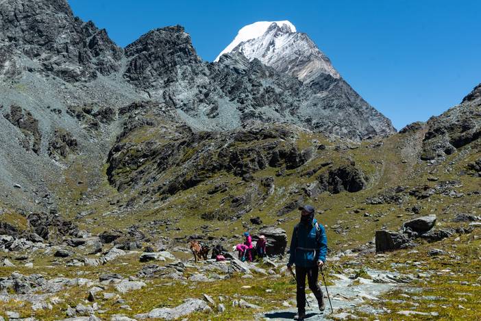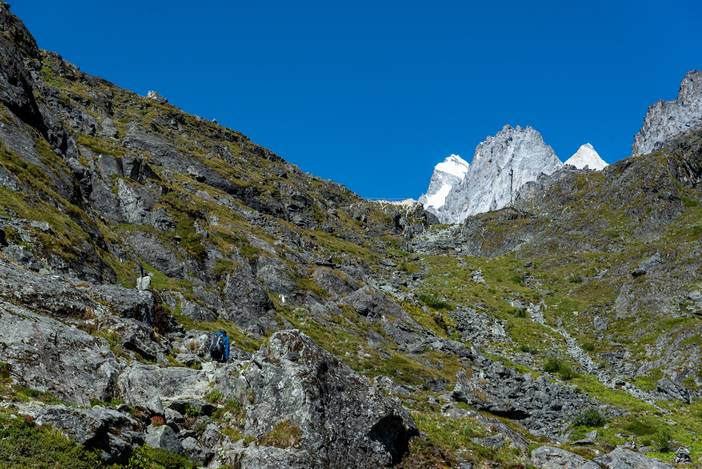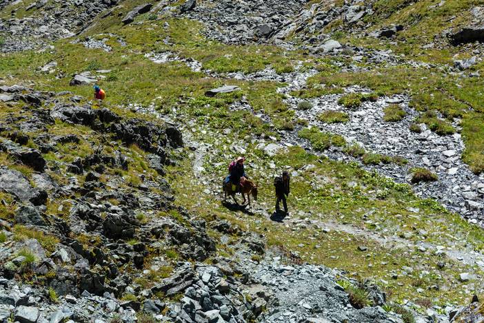 徒步Day5,又是一个全程晴朗的徒步之日,这也是全程最难的一天,因为有很长一段乱石坡的斜切,要谨慎通过,队友熊和吴也是考虑线路风险,而选择了徒步,在其中最险的一段,她们甚至都不敢直立通过,而准备手脚并用,最后在我和马帮的扶助下,安然通过。