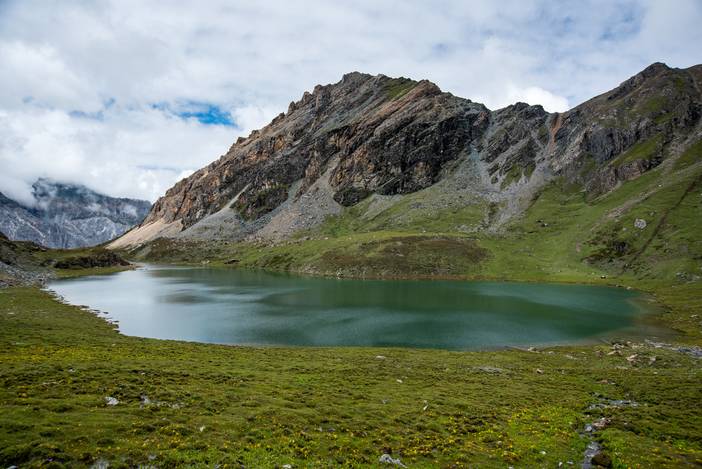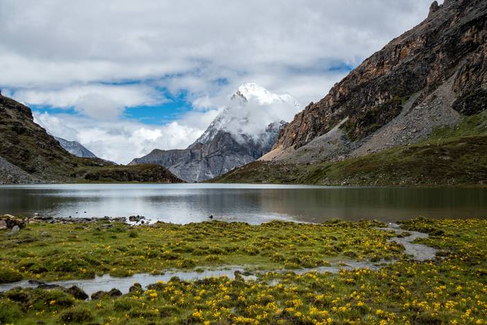 热松措的湖畔开满了野花,央迈勇从垭口背后露出一个肩臂。