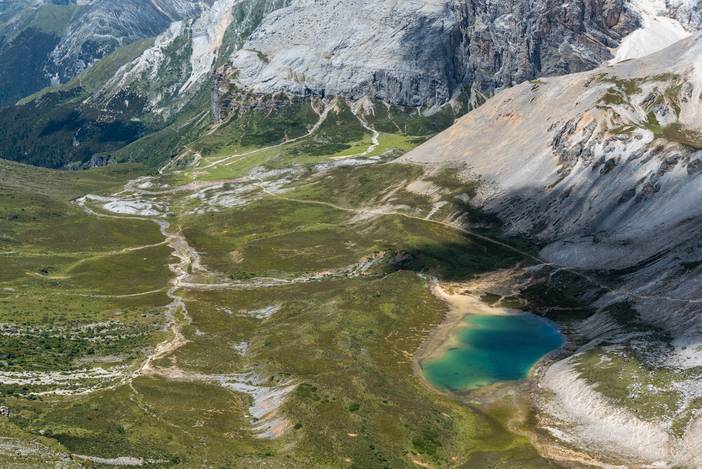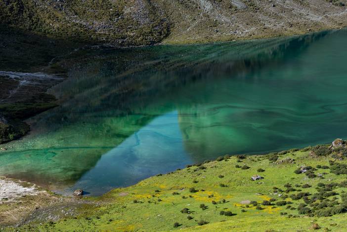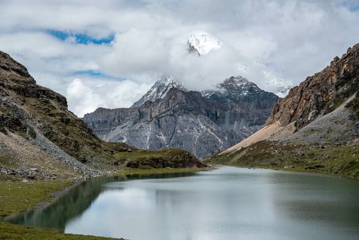 翻越黑湖垭口之后,央迈勇的西坡和仙乃日神山又重新出现,在翠绿色的蛇湖,我们也与本日风景最高潮相遇,山水相映,仿如画卷。