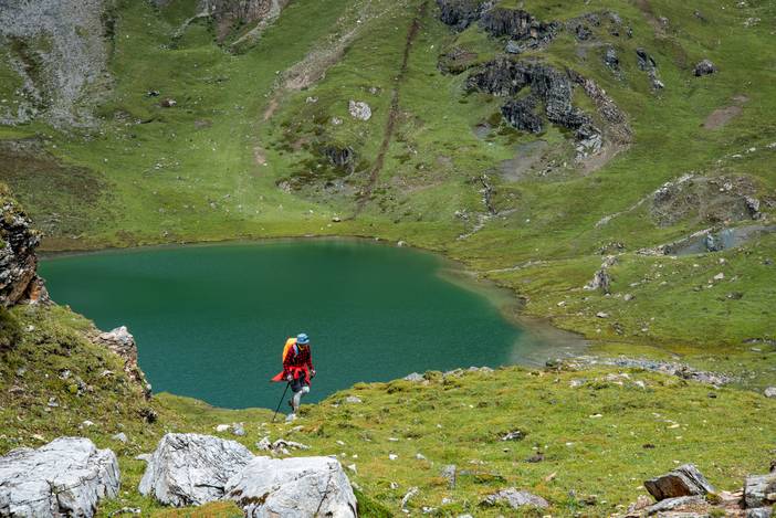 队友KK恰好从湖畔的山坡经过,我拍下这张美照。