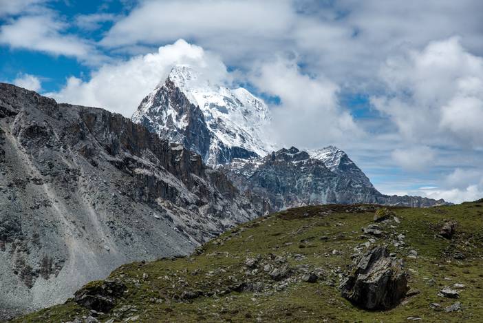 夏诺多吉神山从垭口后方显露出来。