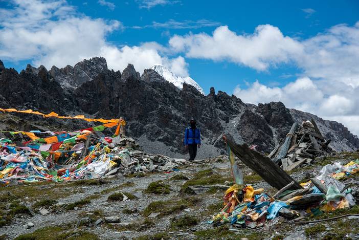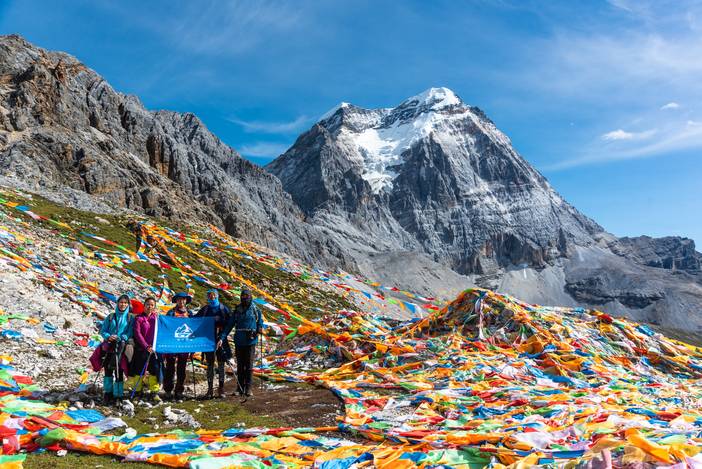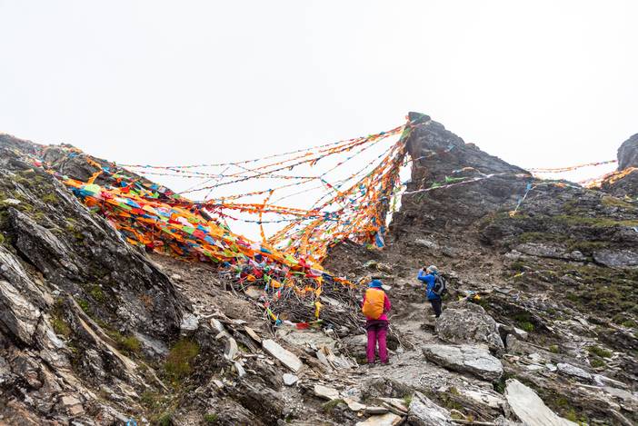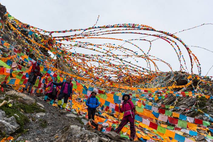 从营地出发到垭口的一段是起起伏伏的上坡,在海拔4500米的垭口,我们遇到了层层叠叠的经幡阵,这都是徒步转山的藏民悬挂的,我们也在此悬挂了一条长长的五彩经幡,为世界和平和自己的亲友祈福。
