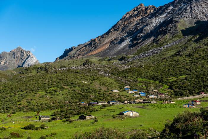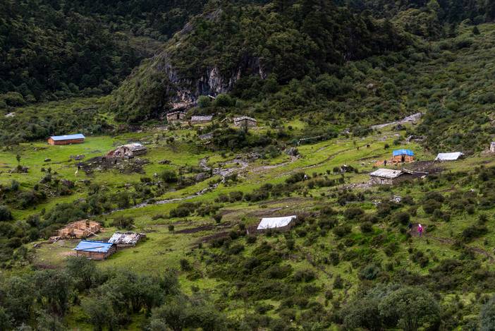遍布木屋的嘎洛牛场,这些房子主要是本地藏民挖虫草和放牧使用。