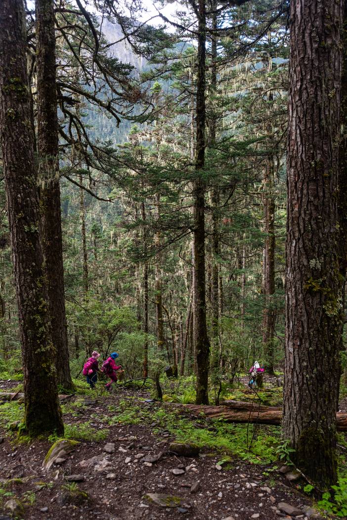 徒步Day3,嘎洛牛场的清晨,天气晴好,不过出发后的第一段路就遇到积水的山路给徒步造成了一些干扰,幸好不长,大家都有惊无险的通过了,随后进入原始森林,合抱粗的大树随处可见,树上挂满了松萝,而夏诺多吉在树林间若隐若现,我们中午时分到达白水河发源的贡嘎扎则牛场,这里也是夏诺多吉雪山的东坡,正对雪山,百年前的洛克博士曾在此露营多日,采集动植物标本和种子。并在此第一次看到夏诺多吉。