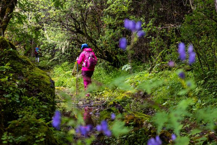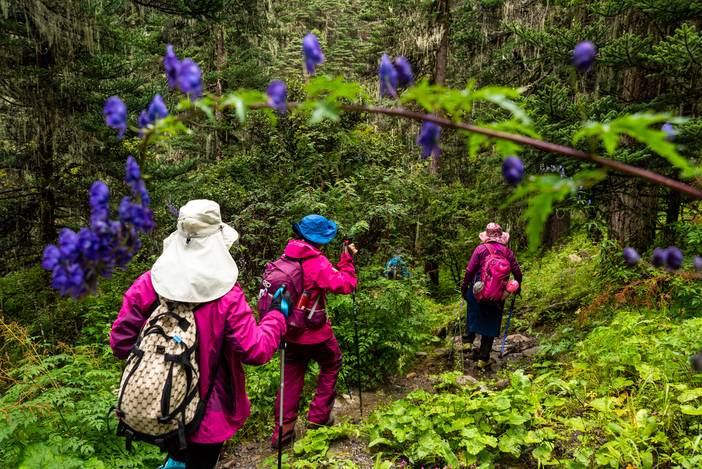 丛林小路上不时出现的野花,图中为蓝紫色的乌头花。