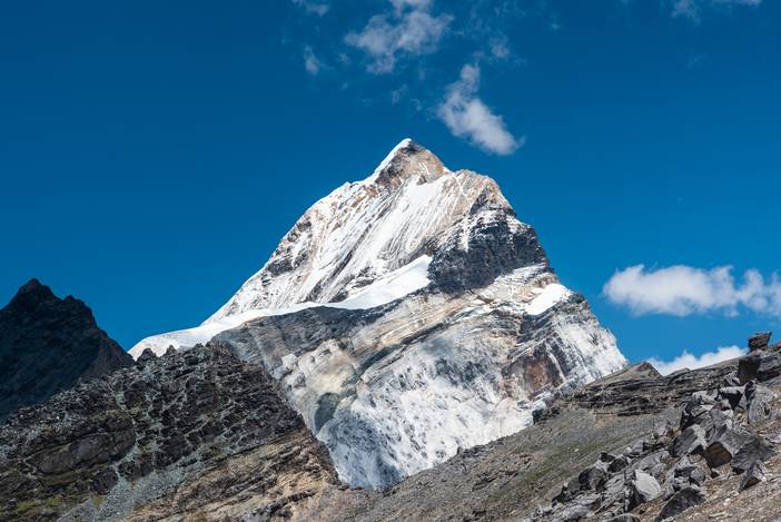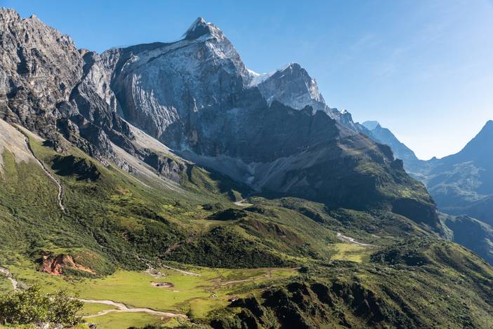 走出丛林,视野开阔,神山夏诺多吉迎面而来。