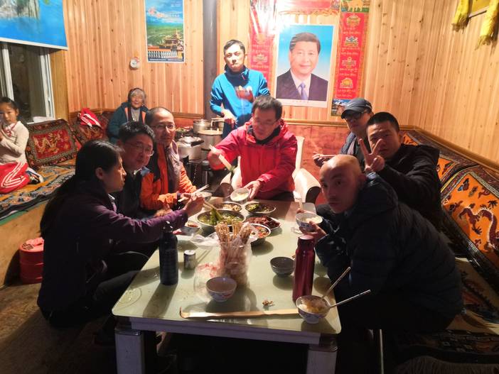 晚餐后贡嘎纪录片继续,向导雄鹰和他的儿子也加入我们的观影团,看着纪录片里播放他们熟悉的故事和影像,还有自己亲友入镜,也是津津有味。