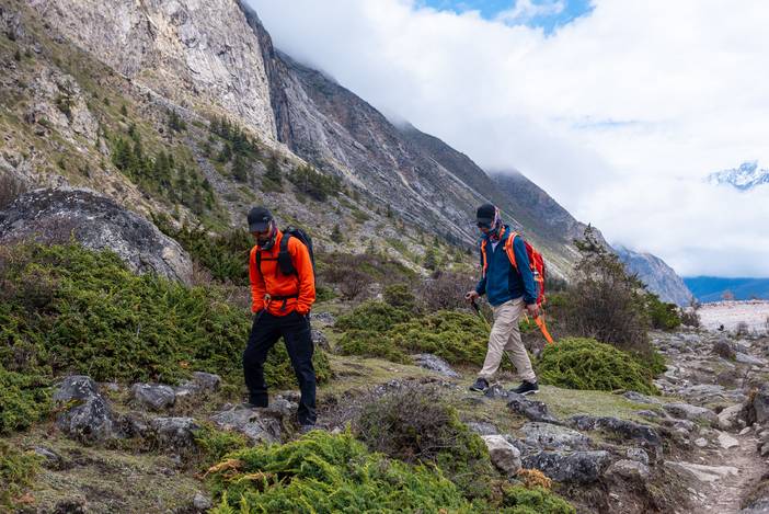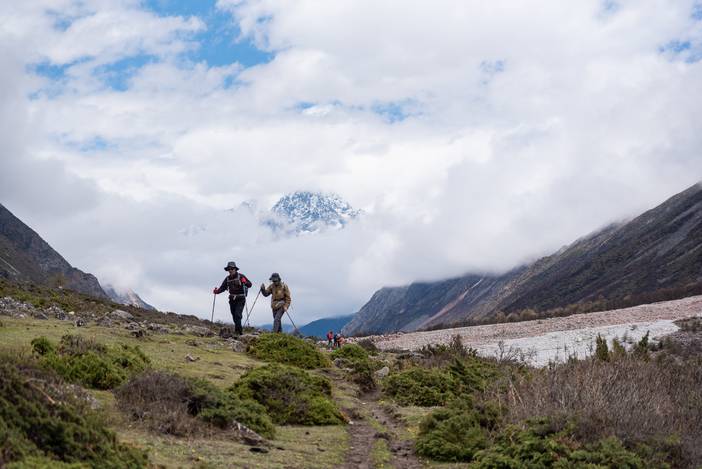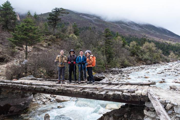 昨天天气不好,晚上甚至下雪,本日的天气虽然好了一些,还是以多云为主。不过我们徒步过程中,身姿俊秀挺拔的小贡嘎一直陪伴我们,也是为大家的好心情锦上添花。
