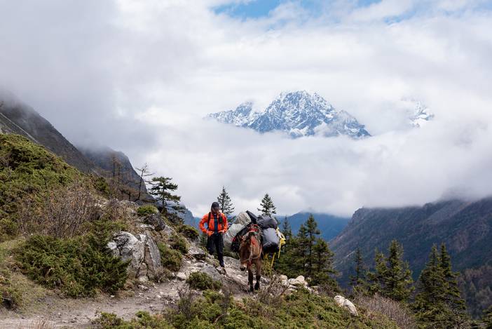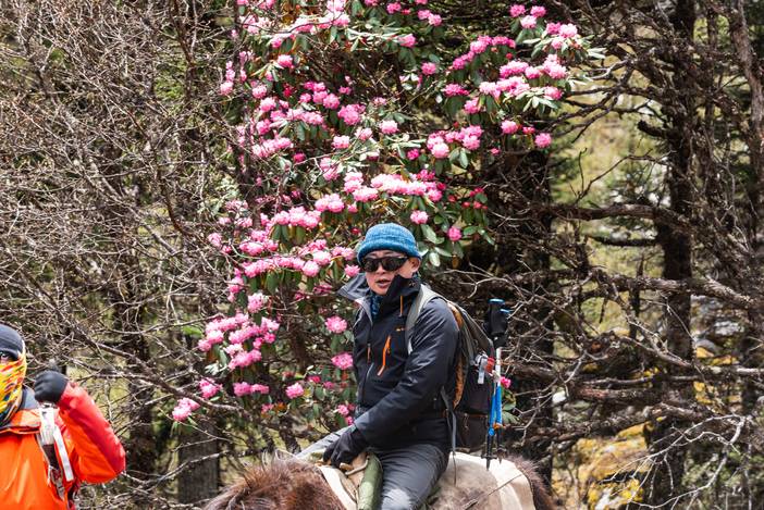 老孙和陈姐,以及来往,都已经预订了马匹,其他5位队员在唐杰带领下先行下山,我跟马帮收拾营地后,也开始下山。由于开始的一段山坡比较陡峭,为了安全起见,我带着他们3人徒步了1个小时到达传统徒步路线上,这时,马帮也赶上我们。