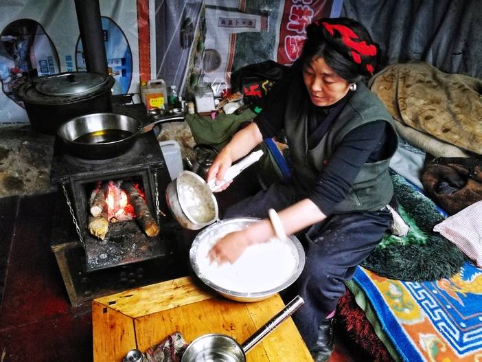 (两岔河营地,当地藏民搭建的小石屋,向导的妻子正在制作第二天的早饭-大饼)