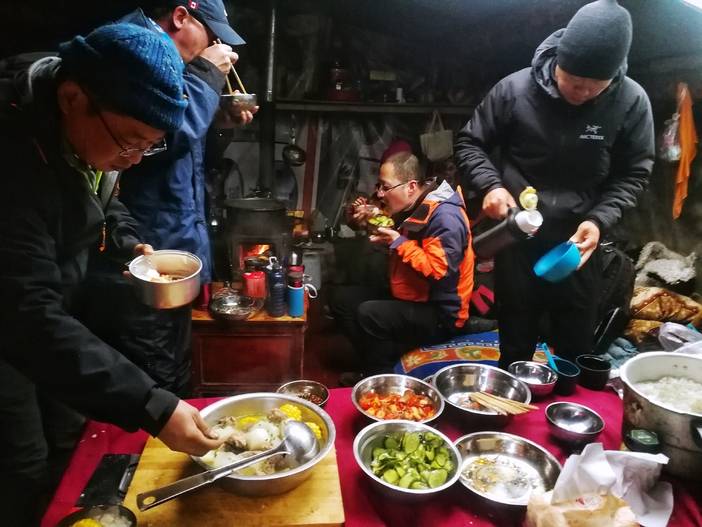 晚餐后,我打开投影仪,为大家放映了中国新生代攀登者阿左和昊昕攀登四姑娘山幺妹峰的视频。还有中央电视台制作的贡嘎纪录片。