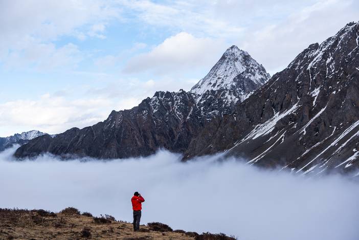 本日天气不是很好,一直阴云密布,日乌且沟内的云雾时常如江河波涛翻涌。而小贡嘎也是时隐时现。