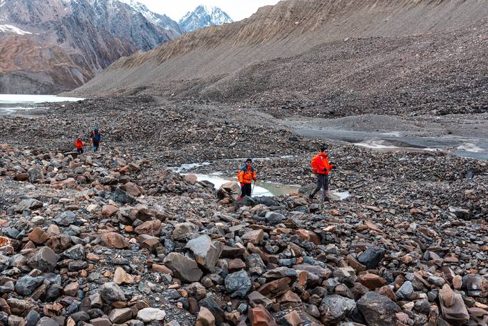 虽然本日重头戏是冰川行走,在到达冰川之前,我们还有一段艰难的路要走,那就是冰川从山岩剥蚀下来的砂石堆砌而成的碛垄和丘壑。穿破细密的雨丝,我们先来到勒多漫因冰川融水汇聚而成的冰湖,虽然已是五月,湖面仍然为澄蓝的冰面封盖。