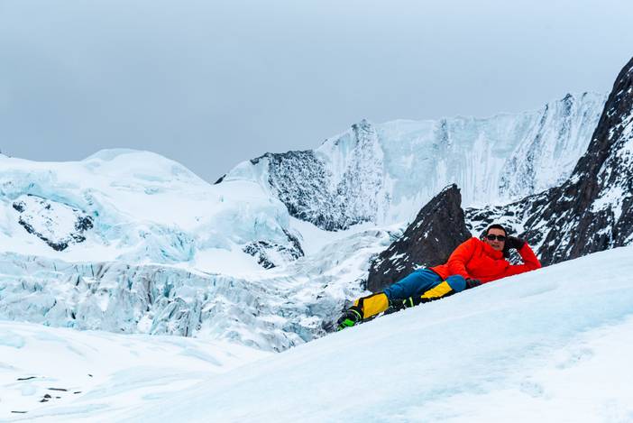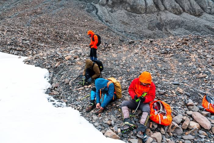 (终于到达冰川末端,稍作休息后开始穿戴雪套冰爪,为徒步冰川做好准备)
