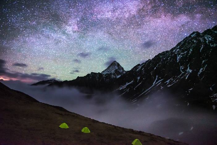 原本计划夜晚拍摄星空银河,但是计划中2点开始的银河拍摄被阴冷的云雾破坏。只是在9点多的时候拍了帐篷和小贡嘎构图的星空营地照片。