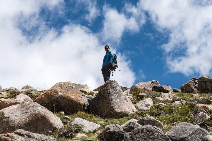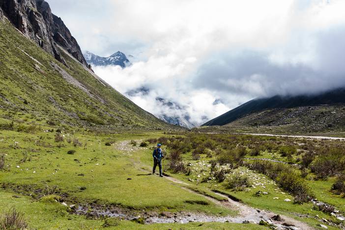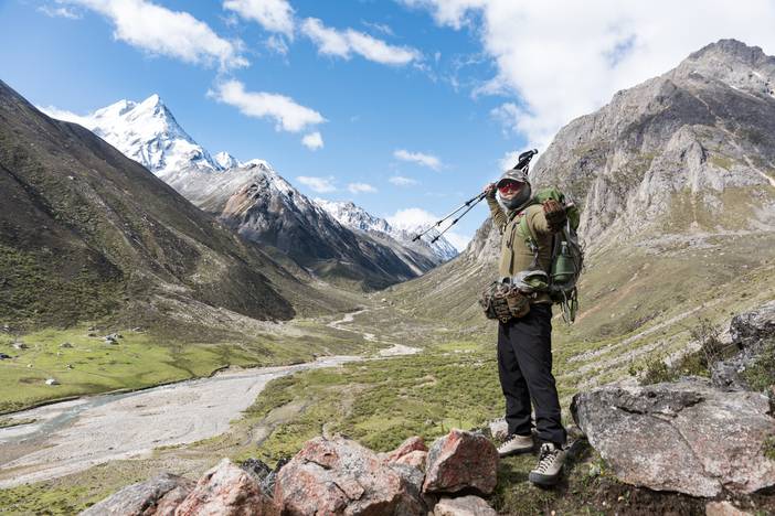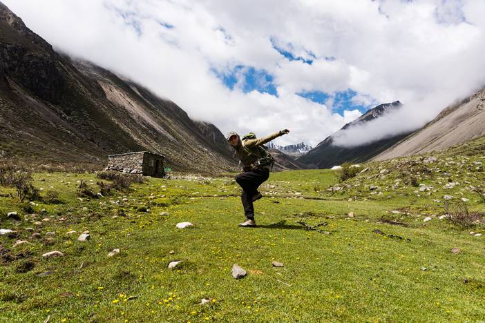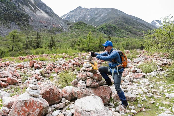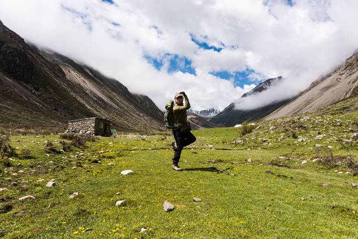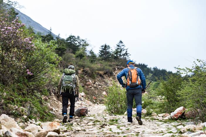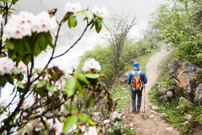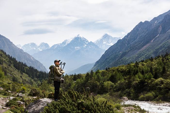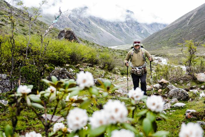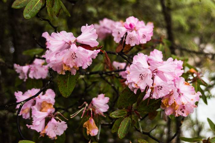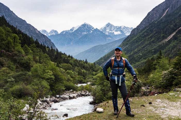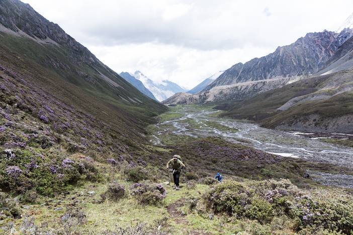 D2、早上吃过简单的面条之后,收拾装备,就乘坐客栈老板的车子,前往徒步起点。之后没有信号的日子就开始了,远离手机,远离城市,远离烦恼,开启我们的徒步之旅。沿着溪流一路往前,路边的杜鹃花开的茂盛,首日徒步约十公里左右,强度不是很大,可以慢慢适应海拔。我拿出相机,一路走一路拍,也不觉得累。任大哥是个喜欢玩小视频的人,一路上拍了几十个抖音,抖音达人呐。