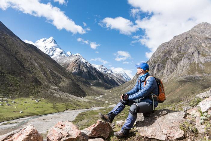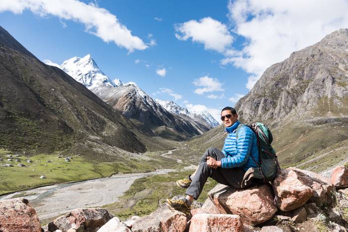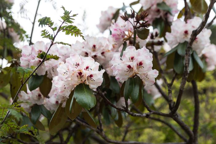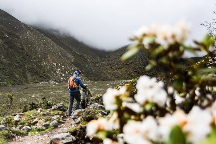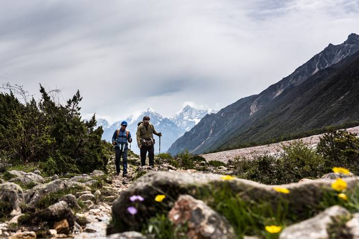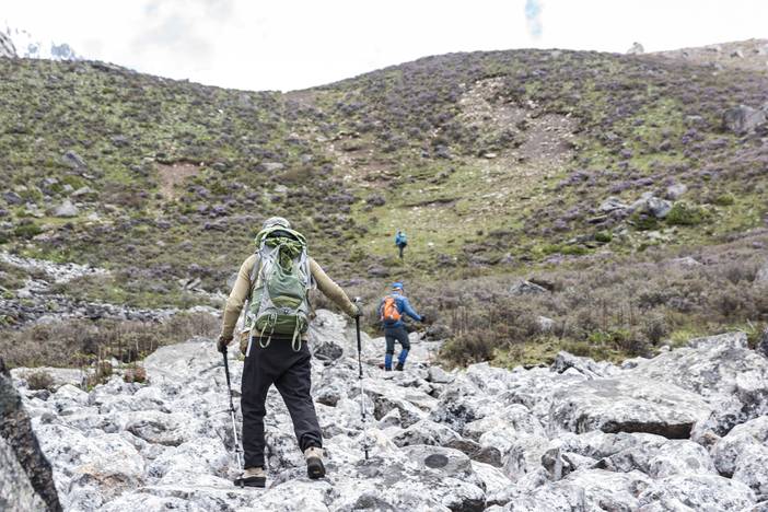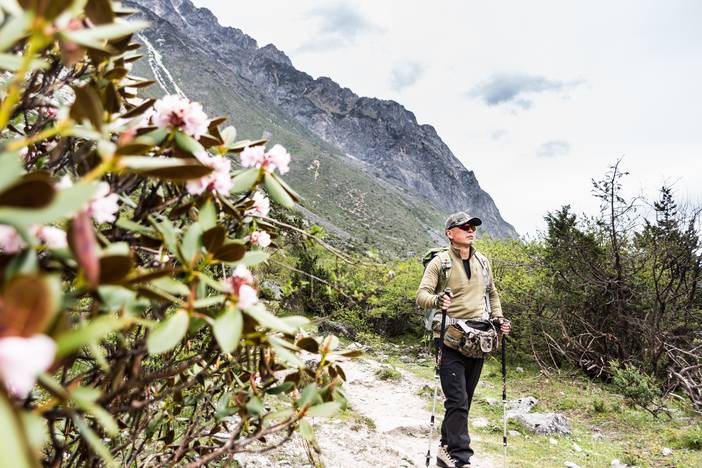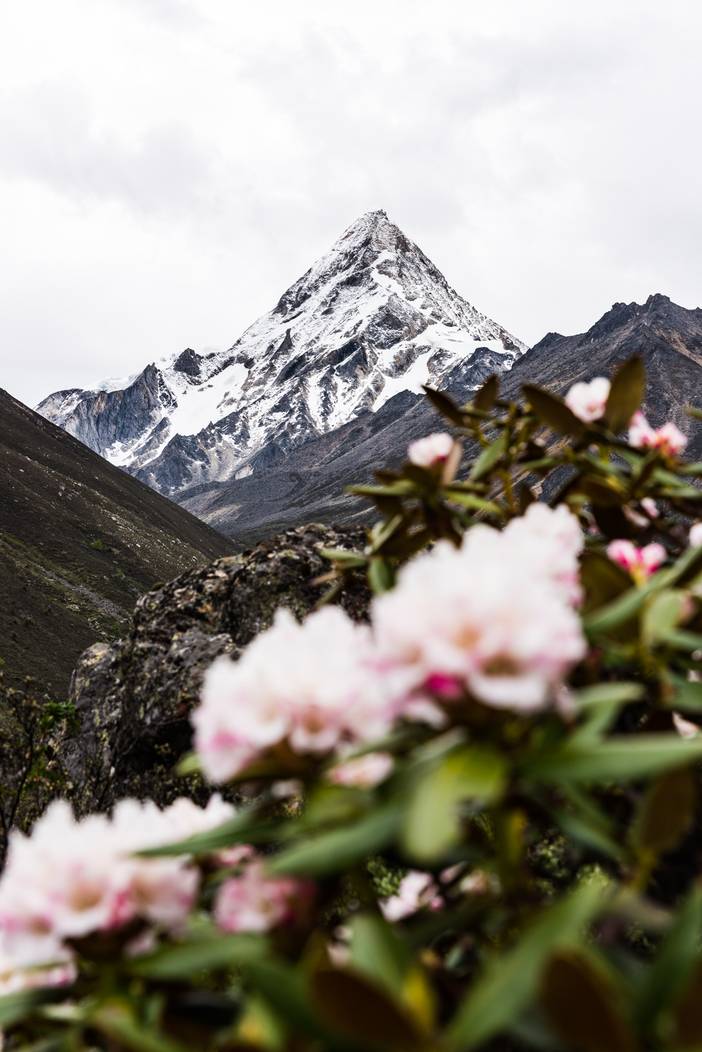 一开始还有些担心常哥的不适应,后来开始徒步,发现常哥的状态还是可以,就慢慢放下心来。这一路,杜鹃花开的是最茂盛的,我就拿着相机各种以花为前景拍雪山,拍徒步的照片。今天有两段上坡稍有难度,我们就放慢行进速度,爬坡还是以稳为主,不赶时间。