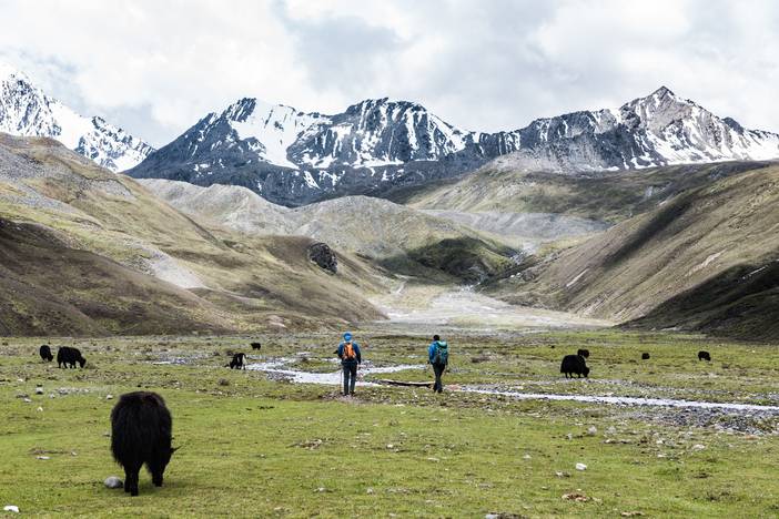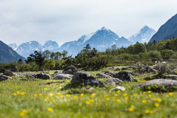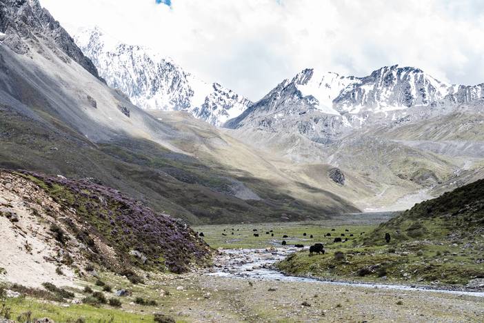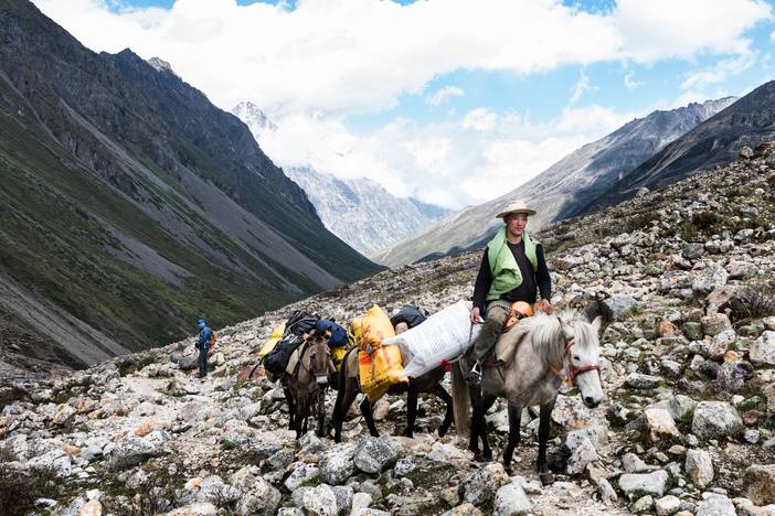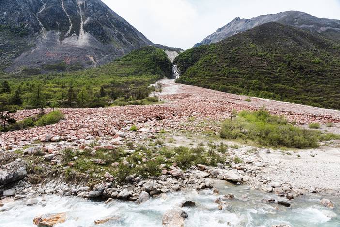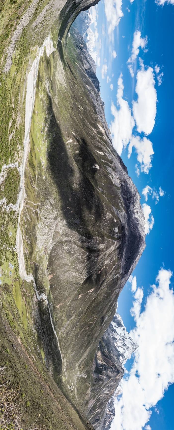 原定行程是今天还是在冰湖营地住一晚,任大哥和常哥商量想直接返回两岔河营地,想要为提早一天返回成都做准备,所以就没有在冰川上逗留太久,就下撤了。任大哥和常哥提前跟马夫说好了要骑马下山,下撤到下日乌且牧场之后,两人就开启了骑马之旅。因卫星电话电池问题,没法联系提前回成都的车辆司机,就决定让183从冰川下来直接返回老榆林,给大家安排好车辆,辛苦183领队了。然后就剩我一个人在最后面徒步返回两岔河。好在一路下坡,沿途也是遇上好几支贡嘎穿越的队伍,然后一路拍拍照片,也没那么落寞了,哈哈。