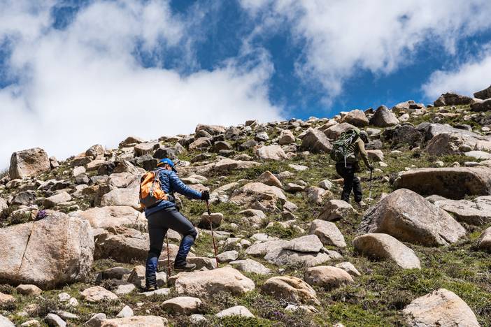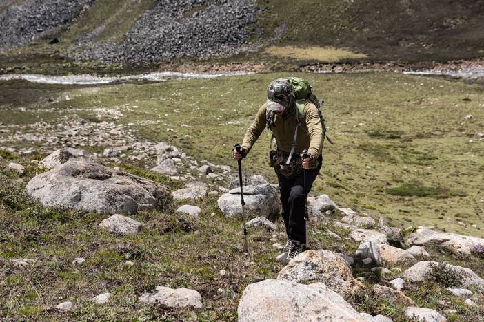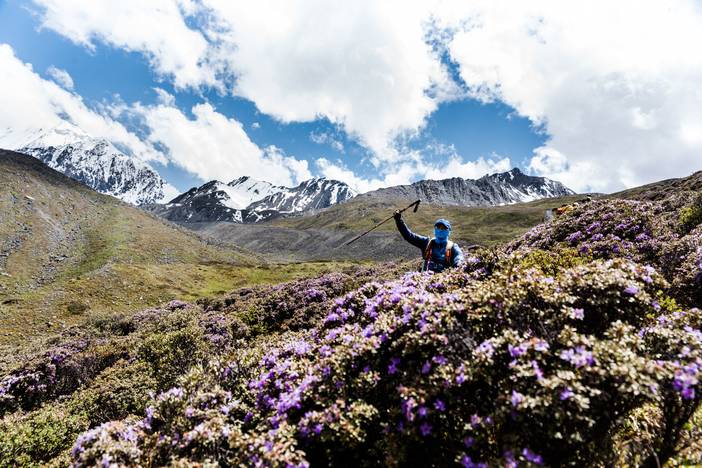 过上日乌且牧场的时候,看到的垃圾确实有点多,传统穿越线第一天的营地就是设在这里,穿越的人一多,垃圾就多,还是希望大家好好的保护大自然,随身垃圾带下山哦。我们穿过牧场,开始最后一段爬坡,满山的高山杜鹃花开成了紫色的海洋,我们就在花丛中穿梭,走的累了,就停下拍一拍这美丽的花海,然后再前行。