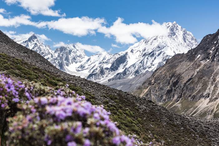 高山小杜鹃花开成海,远处的小贡嘎越发雄壮。