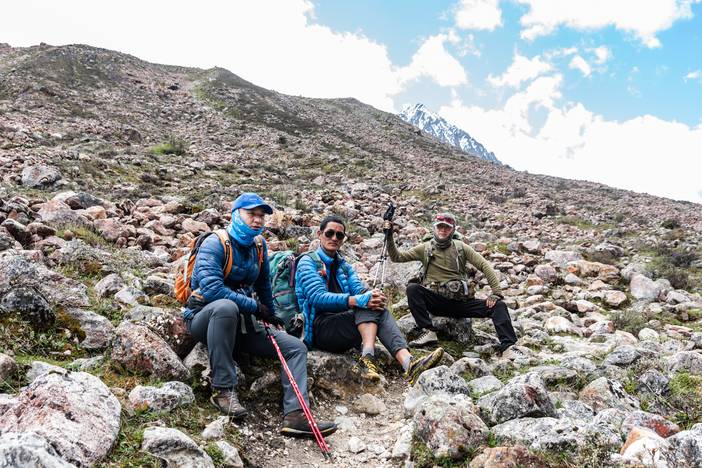 D4、好在天一亮,云雾慢慢散开,又是好天气,适合徒步。吃过简单的早饭,米粥加大饼,我们三人先行出发,领队183照例留下来收拾东西,他脚程快,总能在一个小时之内赶超我们。这一天途径日乌且牧场,前往我们的冰湖营地,为第二天的冰川徒步做好准备。