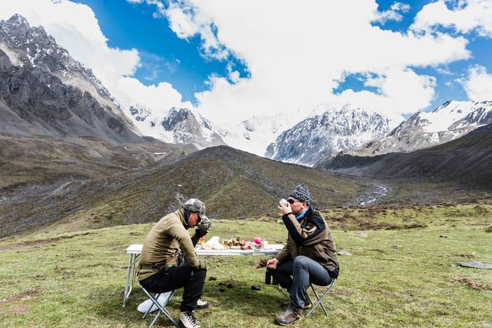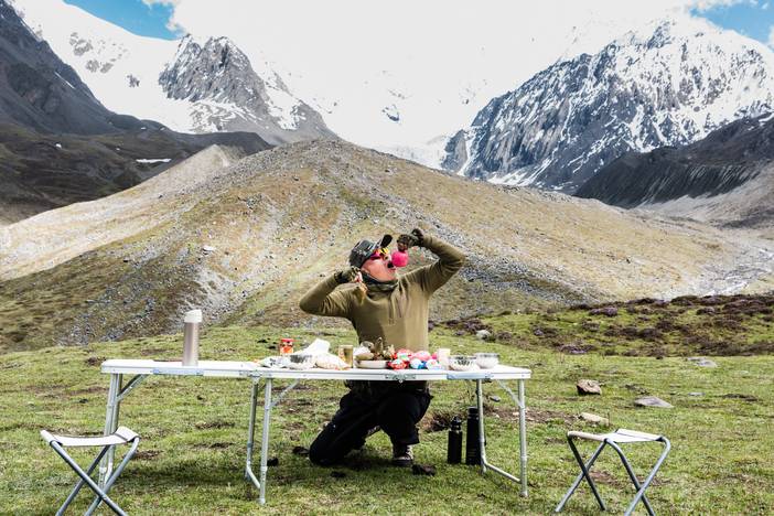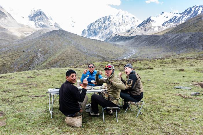 到达营地是下午三点左右,183和马夫就搭建餐厅大帐篷,开始准备晚餐,我稍作休息,把小帐篷搭建好,常哥有些疲累,就先进帐篷休息了一会。任大哥状态一直在线,也帮忙搭建了小帐篷。在高原做什么事情都会有些气喘,所以尽可能的放慢动作速度是比较好的办法,不然动作大了容易头晕高反呢。大家适应了这么些天,基本都适应了高原,唯独常哥还是有一些些的不舒服,好在休息一会也就好很多。晚餐是土豆萝卜炖牛肉,大家都吃的很happy,然而每次都吃不完,一开始大家都会担心食材不够,其实每次都是会买多。到了高原,基本食欲或多或少都是会比平常要下降一些。在高原吃麻麻香的,那恭喜你,你就是海拔适应的最好的其中之一。