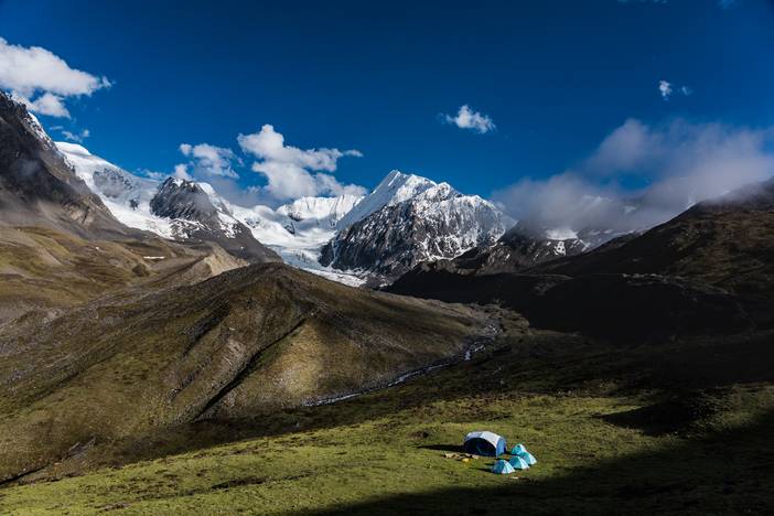 营地全景图,把小贡嘎和勒多漫因雪山冰川都收入囊中。