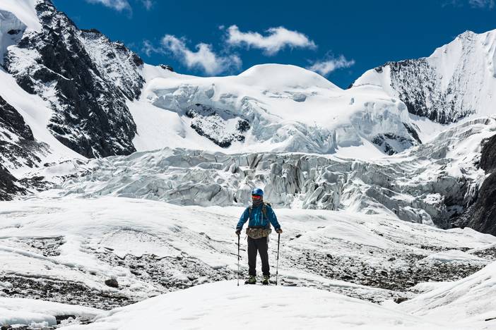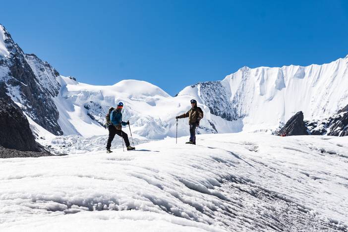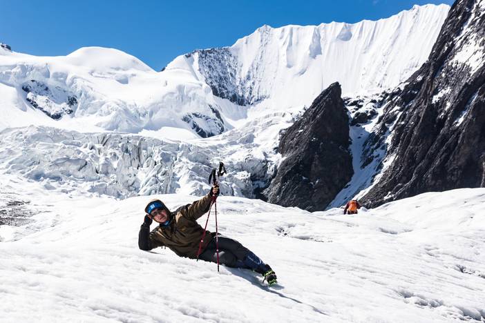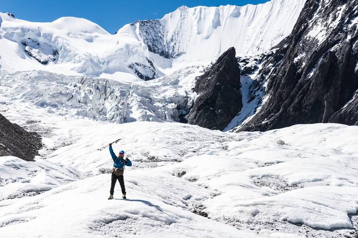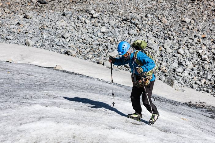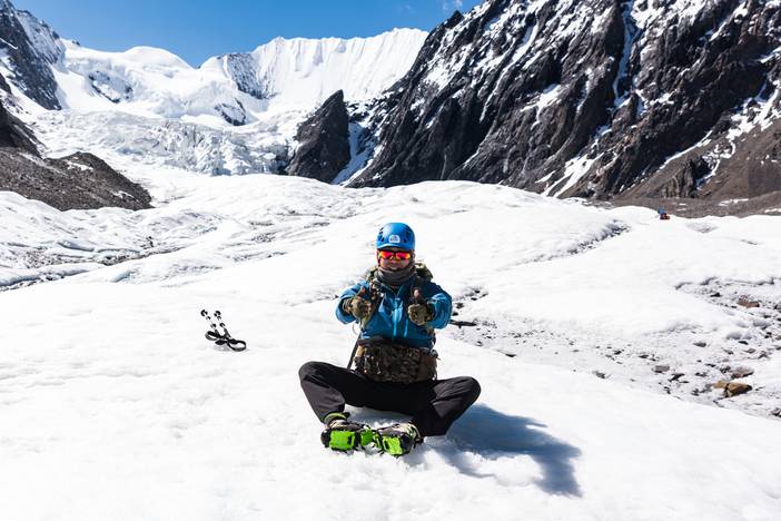 吃过早饭,拿出头盔和冰爪装进背包,就要开始今天的重头戏了,冰川徒步。从营地出发还有一段小陡坡和碎石路要走,小小的考验开始了。常哥的状态还是可以,到达冰川末端我们花了一个小时左右,183已经提前教过大家如何穿戴冰爪了,所以大家都很熟练的穿好了冰爪。冰川冰川,我们终于来了。这个季节的冰川,化水有些厉害,能明显的看到水流,冰川下面还有化了水的小小冰洞,我们在冰川上徒步困难相对要小一些,末端也是很少有裂缝,所以也很安全。