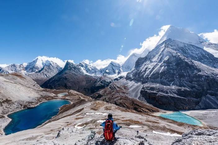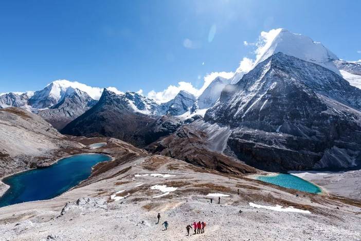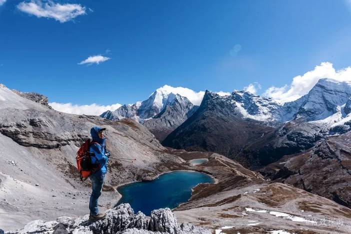 8、双湖打卡点:位于五色海上方的山坡之上,使用超广角镜头可怕拍摄夏诺多吉和央迈勇、五色海和牛奶海,两湖两山的同框照,有网红的潜质。不过山坡岩体破碎,相对危险。