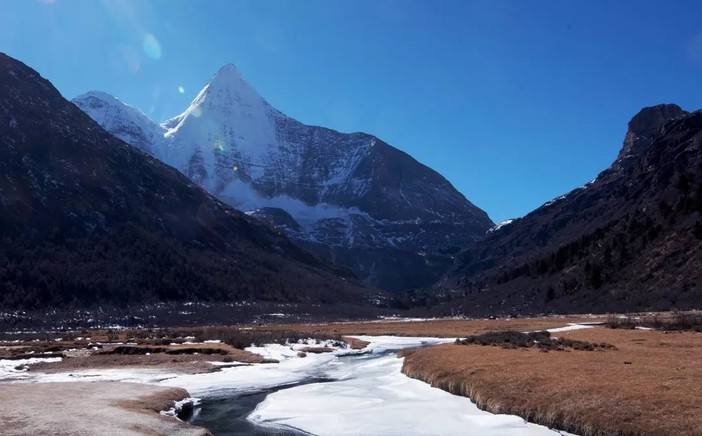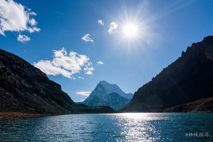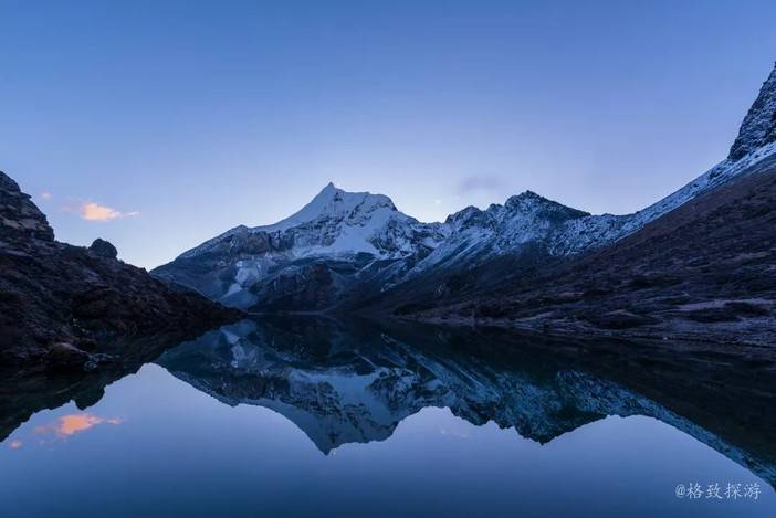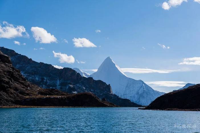 2、波拥措:海拔4700米,湖水碧蓝,可以拍摄央迈勇和仙乃日的倒影和日出金山,附近的高点可以拍摄三神山同框。