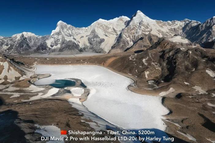 希夏邦马峰,海拔8027米,全球第14高峰,也是唯一一座全部属于中国的八千米雪山,5月23日,我们徒步来到海拔5200米的贡措湖畔露营,壮美的希夏邦马雪山群近在咫尺。下图使用大疆御2航拍。