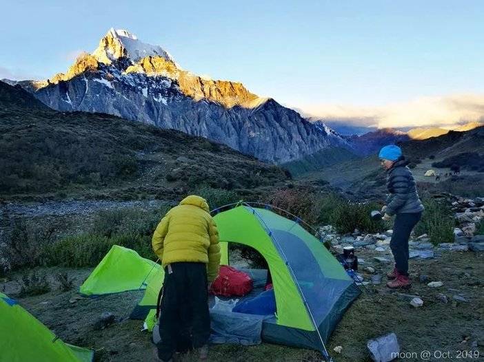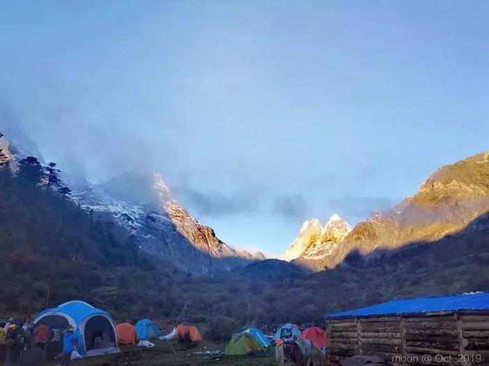 清晨,睡得迷迷糊糊,善友喊人去拍日照金山我没听到。不过,懒人如我即便听到也不愿从舒服的睡袋里钻出来吧!与美景相融,我心安然。