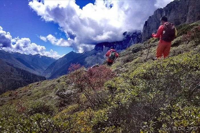 在费劲翻越今天最后一个垭口后,善友说前面不远就是营地,他要继续在山头等其他队员。笨人我在很明显的路上走岔了,一直往下切,明知不对劲,还是冲到悬崖边才绝望地发现无路可走,又心存侥幸可否横切。等了好久,杨平出现在远处,喊我往上爬,说别无他路。这就是一条道走到黑的典范,望引以为戒。