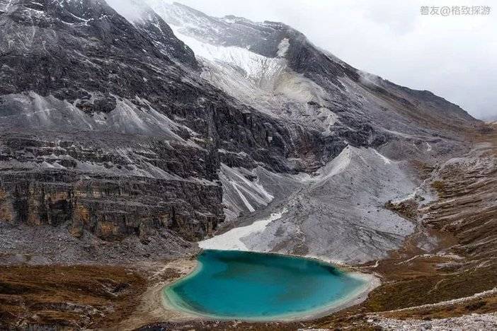 俄绒措(牛奶海),古冰川湖,在央迈勇的山坳里,呈扇贝形,中间是碧蓝的雪水,周边则是一圈乳白色环绕,这圈乳白色大致就是牛奶海名称的由来,上方有大片的冰川。