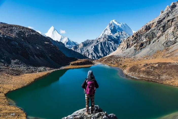 上图拍摄于10月22日,徒步的第一天,我们穿越金黄色的丛林之后,相传为“金刚手菩萨”化身的夏诺多吉神山耸立云端,山谷间遍布彩林。