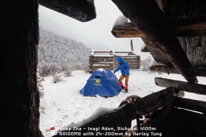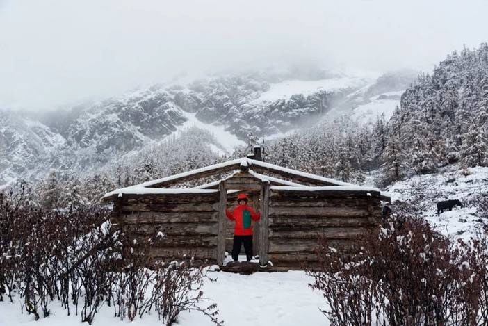 上图拍摄于10月25日,夏诺多吉东坡的贡嘎扎则牛场。前夜一场降雪,将天地覆盖为一色。大家躲进木屋避寒,作为领队的我在拍打帐篷上的积雪时,哈利记录下这个场景。