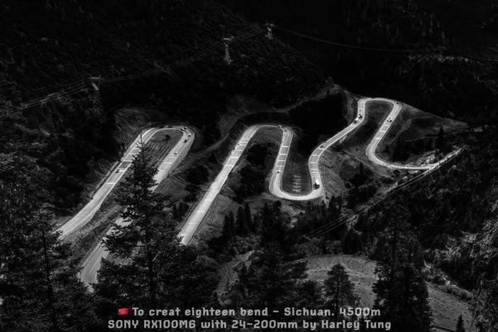 上图拍摄于10月21日,G318国道上的剪子弯山上坡路段由于坡度陡峭,公路在此回环往返,形成了多个发卡弯。