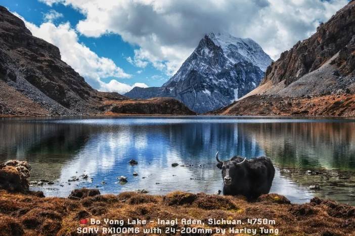 上图拍摄于10月23日,下午的波拥措,冷风阵阵,而层云渐起,哈利和梁老师来到波拥措的另一边,这里可以观赏到仙乃日神山。此时恰好一只牦牛在湖畔停留,目光安然凝视。