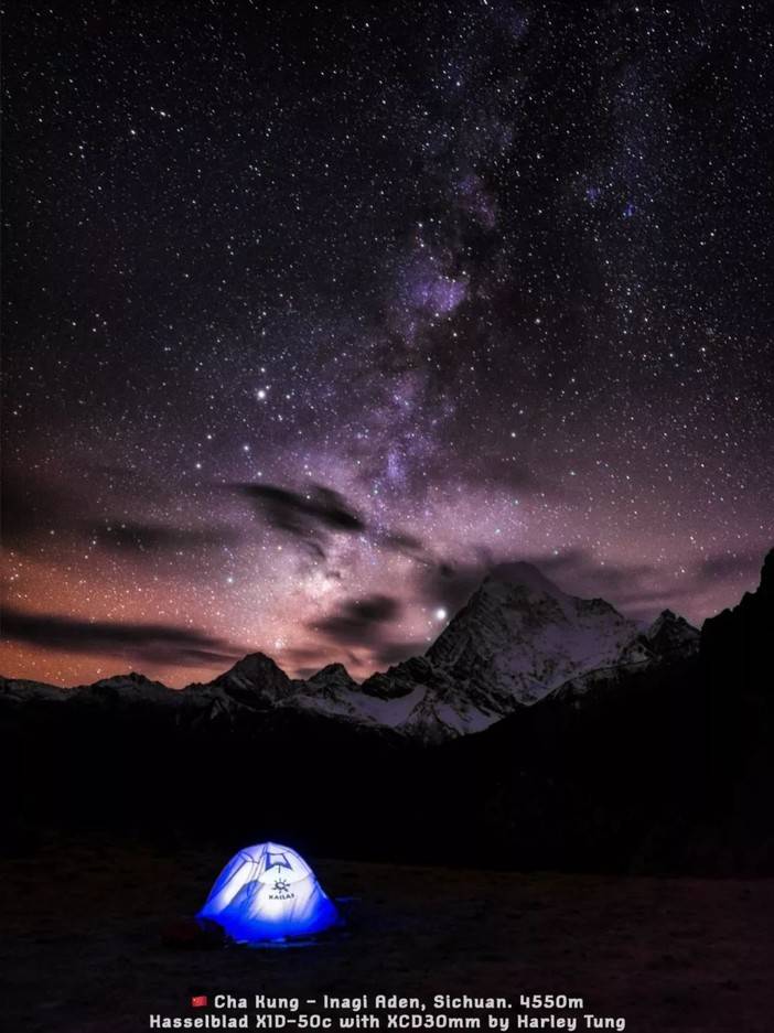 上图拍摄于10月27日夜,夏诺多吉东坡的察贡牛场,群星闪耀,,银河如练,夏诺多吉神山也露出了巍峨的身形,与横跨天际的银河相依相守。