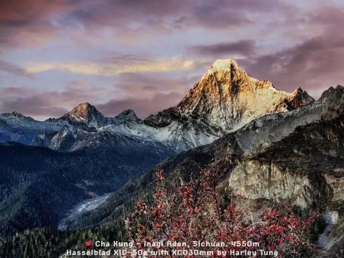 上图拍摄于10月28日,夏诺多吉东坡的察贡牛场,日出时分,朝阳将薄云渲染成梦幻的粉紫色,而夏诺多吉山体也映照为金黄色,一切不类人间之景。