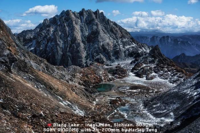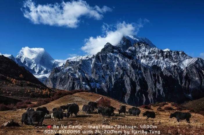 上图拍摄于10月29日,海拔4500米的巴玉营地,这里也曾经是九十多年前著名植物学家约瑟夫·洛克宿营之处。作为本地藏民的牧场,这里有数十头牦牛安营扎寨。图片中的雪山左为央迈勇,右为仙乃日。