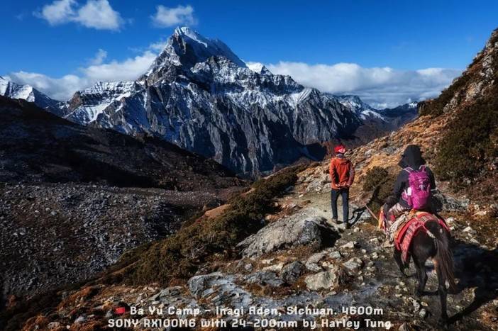 上图拍摄于10月29日,海拔4500米的巴玉营地附近。骑马的于海,前方的雪山为仙乃日神山。