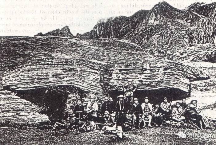 (洛克博士一行在呷独牛场蝴蝶石留影)