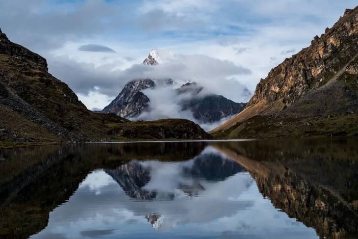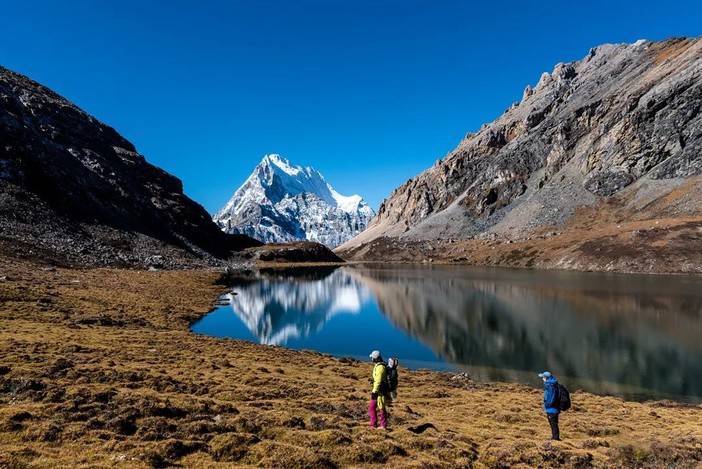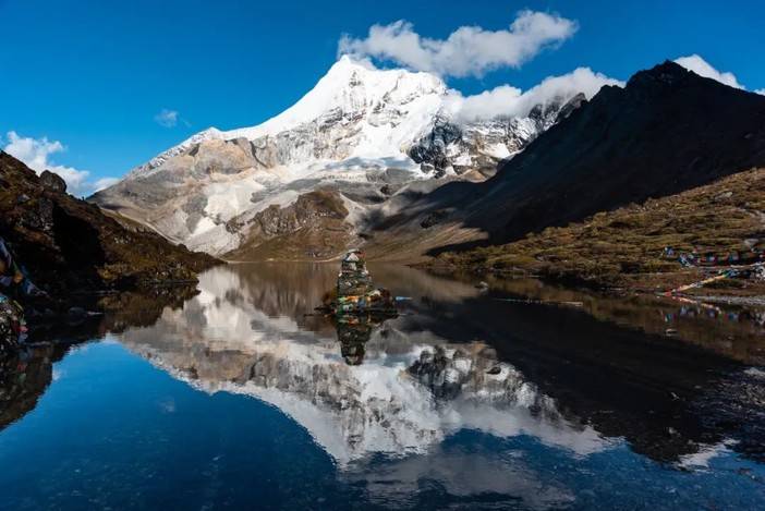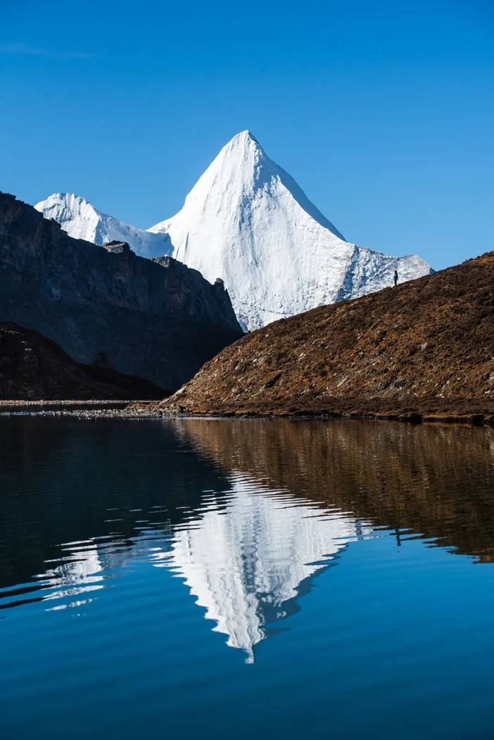 (央迈勇峰在波拥错湖的倒影,注意右侧的徒步者)