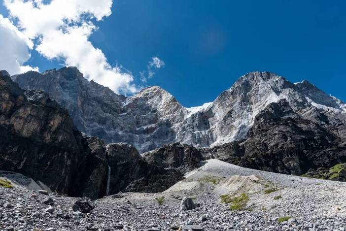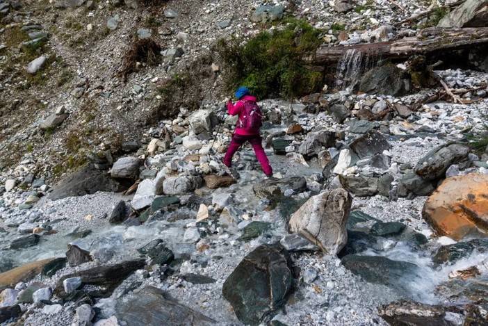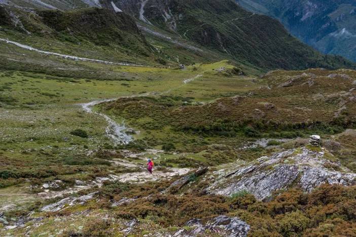 翻过垭口后有1.5公里的下坡,相对陡峭,雨雪天气容易摔跤。其后为1公里的高山草甸,十分好走,也比较适合休息恢复体能。再之后有2段碎石区的横切,这两段碎石区为央迈勇峰南侧悬冰川的终碛垄,现在冰川消融及不可见,只留下垂流而下的瀑布和数米高的终碛垄。由于徒步者较多,碎石区已经走出明显路径,没有太大的难度。