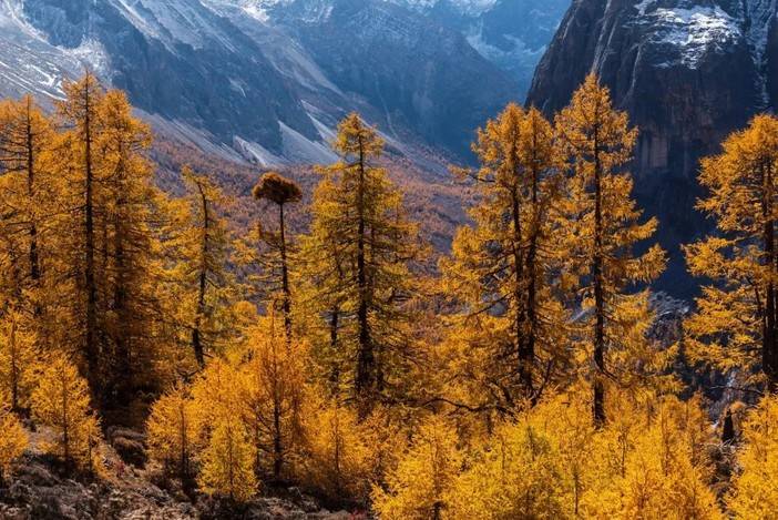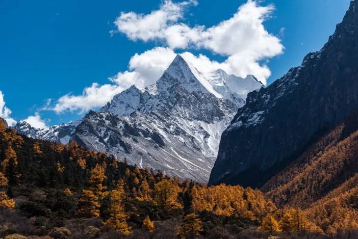 (十月底的彩林与三神山,从左到右分别为夏诺多吉、央迈勇、仙乃日)