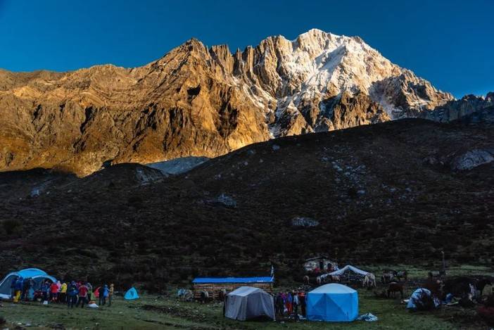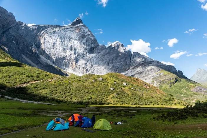 (徒步者在新果牛场扎营,背后为央迈勇卫峰)